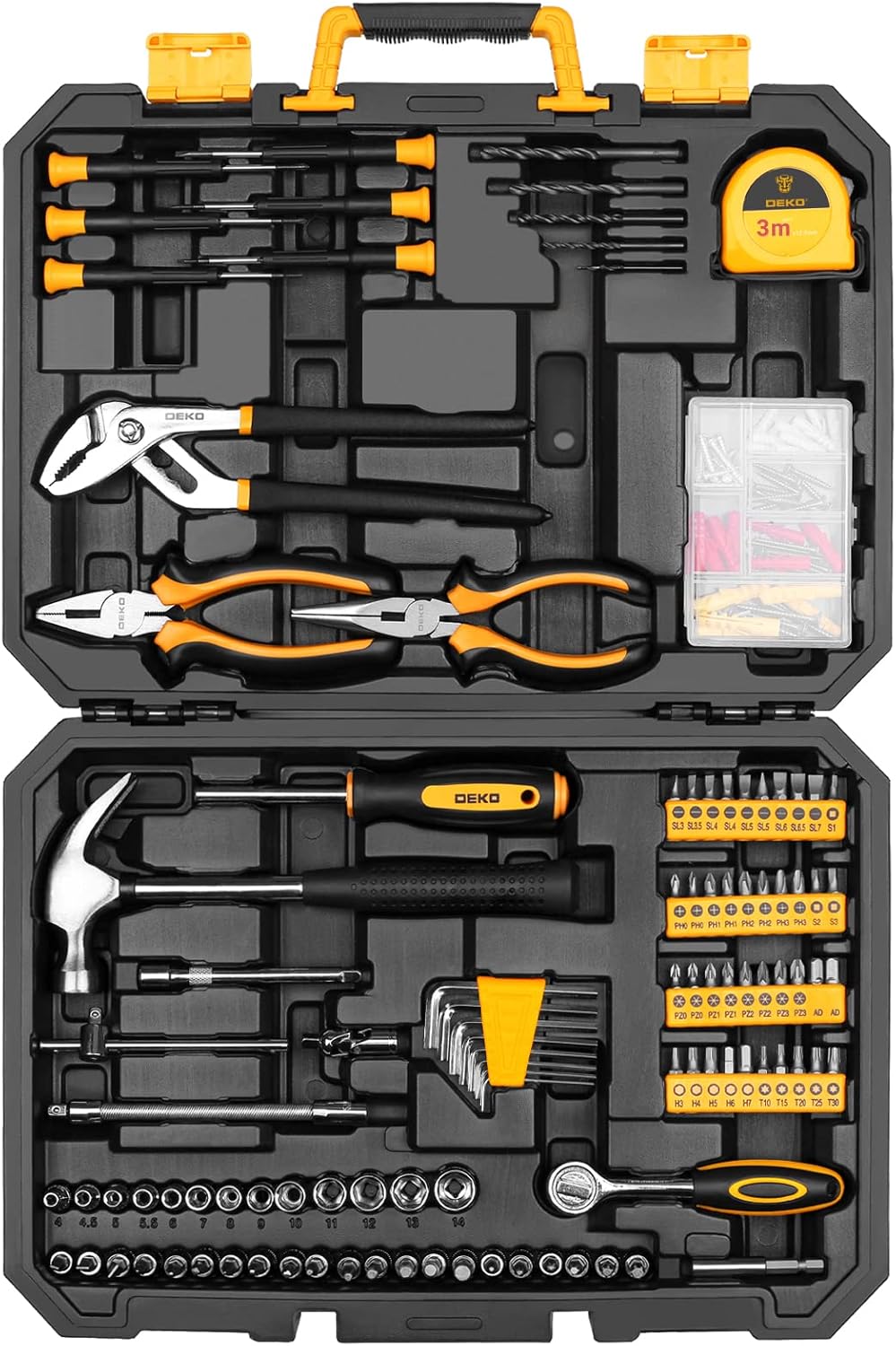 DEKO 196 Piece Tool Set General Household Hand Tool Kit with Rip Claw Hammer,Lineman's Plier, Measure Tape Rule & Plastic Toolbox Storage Case